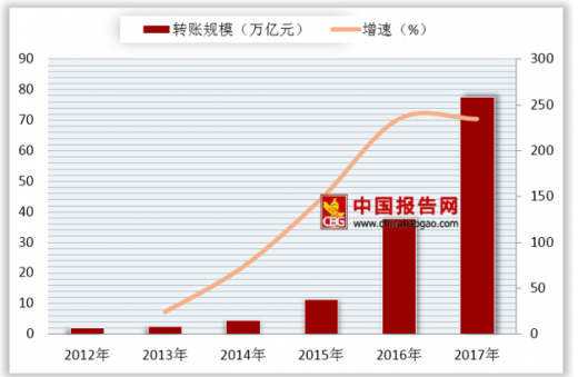 就第三方支付及银行卡转账规模的增长情况进行比较,可见2012-2016年,第三方支付转账增速远高于银行卡转账的增速,但是受多年来我国消费者对银行处理金融业务信任程度的影响,银行卡转账规模转账依然领先。相比于不同的服务群体及业务情况,银行卡转账在2016年笔均金额为1.1万元,多用于对公业务及个人大额支付场景,而第三方支付转账在个人小额支付和生活场景中更具优势。第三方转账凭借其便捷性、灵活性及时效性等优势,逐渐在个人转账业务上获得认可。2017年的转账规模达到77.6万亿元,未来第三方支付转账在个人转账业务上有逐步替代银行卡转账的发展趋势。