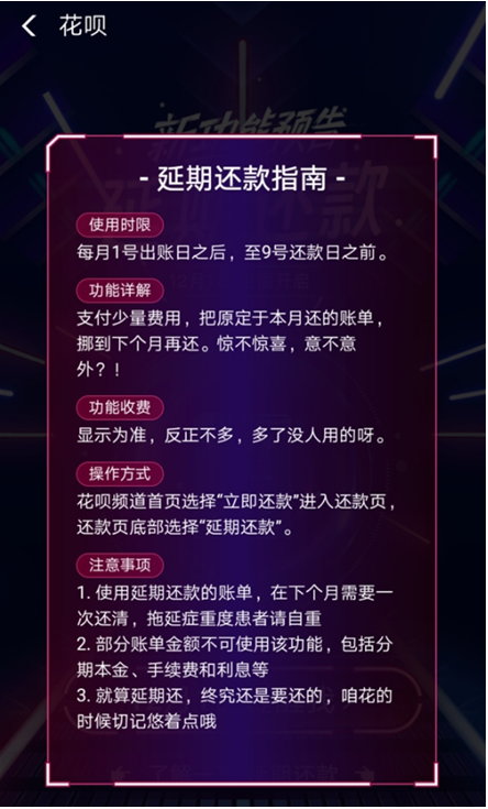 12月12日,支付宝上线新功能预告称,花呗延期还款功能将于12月1日全面开启。根据官方指南显示,花呗延期功能的使用时限为每月1号出账日之后,至9号还款日之前。可支付少量费用,把原定于本月还的账单,挪到下个月再还。需要注意的是,使用延期还款的账单,在下个月需要一次还清,且部分账单金额不可使用该功能,包括分期本金、手续费和利息等。