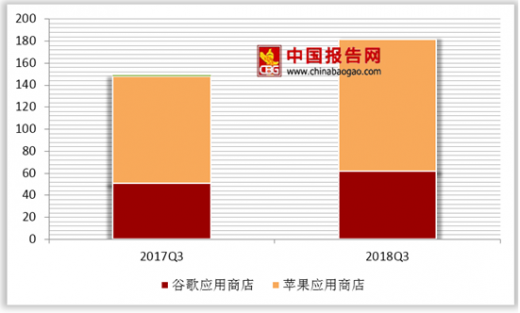 全球移动应用收入及下载量2018年第三季度,来自苹果应用商店的收入占全球应用总收入的66%,将近120亿美金。与去年第三季度97亿美金的收入相比,增幅达23.3%。谷歌在全球(除中国以外)的应用商店收入为62亿美金,对比2017年第三季度51亿美金的营收,实现了21.5%的增长。