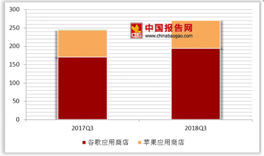 第三季度两个应用商店合计下载量近271亿次,对比2017年第三季度244亿下载量,增幅为10.9%。得益于低成本安卓设备在发展中国家的迅速普及,谷歌应用商店的安装量达到195亿次,对比2017年第三季度的171亿安装量,增幅为14.3%。在ios平台,第三季度安装量将近76亿次,对比去年同期的73亿,增长3.1%。