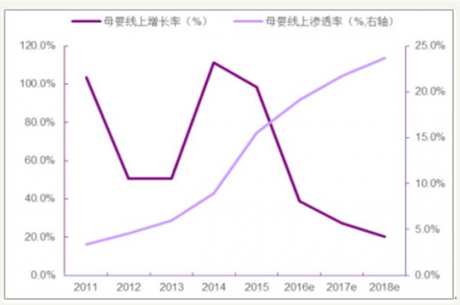 过去5年母婴网购市场的交易规模一直在稳定增长,且增长率高于线下母婴渠道的增长率;然而母婴线上渗透率虽然在不断提高,却仍然低于、3c等其他产品。我国2015年底线上渗透率为15.5%,而同期美国已经超过20%,因此我国母婴线上渠道的发展程度还有进一步拓展的空间。从2014年起母婴线上交易规模增长率已经超过了平均的增长率,呈现飞跃式增长态势;随着婴儿潮的到来、移动端app的普及以及全球购的风靡,母婴电商将迎来更大的发展机遇。
