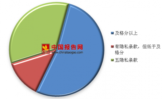 测评中隐私条款各指标总分为70分,在100款中仅有一半(53款)的隐私条款得分达到及格分以上,而有13款app具备隐私条款,但得分低于及格分,另外有超过三分之一(34款)的隐私条款得分为0,即未对用户公布个人信息隐私条款。其中,中国工商银行、支付宝、ofo小黄车等知名app均上榜。