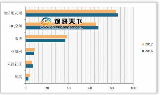 朋友圈、qq空间作为即时通信工具所衍生出来的社交服务,用户使用率分别为84.3%和65.8%;微博作为社交媒体,得益于名人明星、网红及媒体内容生态的建立与不断强化,以及在短视频和移动直播上的深入布局,用户使用率持续回升,达38.7%,较2016年12月上升1.6个百分点。垂直类社交应用中,豆瓣作为兴趣社交应用的代表,用户使用率为8.6%。