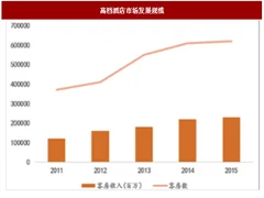 预计:“2022年,中国中产阶级数量将从2012年的1.74亿家庭增长至2.71亿家庭。”未来,中国中档酒店市场的潜在消费人群有望以年增长 10%左右的速度持续扩大。2011-2015年,国内高档酒店市场客房规模快速增长,年均增长率达到了13%;客房收入增速达到11%。截止2015年底,高档酒店市场的规模达到65万间客房,收入规模超过2074亿人民币。