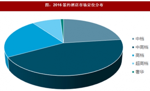 2016年中国大陆地区中档及其以上国际品牌全年签约酒店 330 家,较2014和2015年签约数量明显提升将近 30%。其中中高档及中档酒店签约酒店数大幅提升, 中档合计222家,占签约总量的 67%;高档酒店签约76家,占签约总量的23%; 超高档和奢华型酒店签约数量较少,合计占比 10%。
