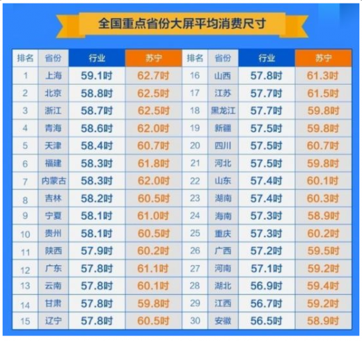 《2017彩电大屏消费报告》显示,上海、北京、浙江作为发达地区的代表,处于大屏彩电消费第一阵营。青海、天津、福建、内蒙四省市紧随其后。上海地区大屏平均消费尺寸达到59.1英寸,位居全国第一。同时,我们也可以看到,该地区苏宁平均大屏消费尺寸已达到62.7英寸。再次证明,苏宁已成为消费者购买大屏的第一渠道。