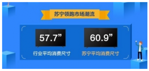 2017年家电市场需求放缓,但大屏消费增长趋势却愈加明显。中怡康数据报告显示,2017年彩电电商零售分析中,60、70英寸电视零售额及零售量市场份额增速远超绝大部分尺寸段电视。此次发布的报告中也可以看到,2017年彩电平均消费尺寸已经达到了57.7英寸,而苏宁平均消费尺寸达到了60.9英寸,成为大屏彩电第一销售渠道。