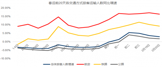 前20天,全国累计发送旅客人数13.83亿人次,同比下滑1.85%,其中航空运输累计发送旅客3211万人次,同比增长11.5%,铁路运输发送旅客1.71亿人次,同比增长3.6%,道路客运累计发送11.6亿人次,同比下降2.9%,水路客运发送2232万人次,同比下降1.2%。