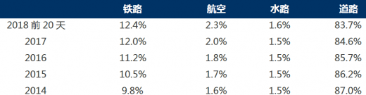 1)道路客运占比持续下滑,铁路与航空占比提升