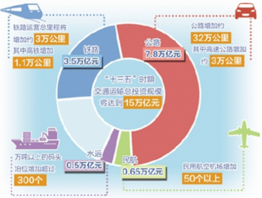 2017年2月,国务院印发《“十三五”现代综合交通运输体系发展规划》,该规划是国家“十三五”国民经济和社会发展规划纲要中22个国家级重点专项规划之一。在整个“十三五”期间,全国交通运输总投资规模将达到15万亿元,其中公路总投资规模为7.80万亿元,占比52.00%。
