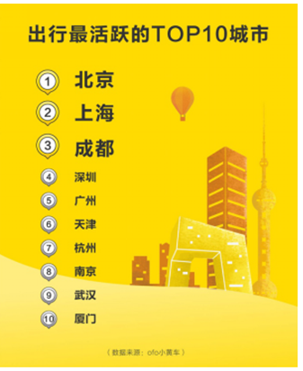 同时,《报告》预测五一期间共享单车出行最活跃的10座城市,依次为北京、上海、成都、深圳、广州、天津、杭州、南京、武汉、厦门。成都将超越广州、深圳,成为共享单车出行最活跃的第三大城市。