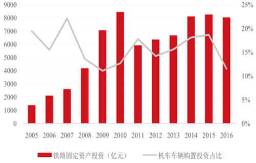 在铁路固定资产投资中,机车车辆投资是重要组成部分,随着高铁网络的完善和出行需求的增加,高铁动车车辆需求加速上升,近年来机车车辆购置投资占比在稳步上升。“十三五”期间着力批量购置新型动车组上线高速铁路,全面提升机车车辆装备现代化水平。在“八纵八横”规划下,未来高铁网络的进一步完善,将对高铁车辆产生更高的需求,因此高铁动车等机车车辆购置仍会稳步增长。