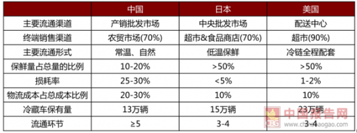 在流通环节上,我国仍是以多层次的产销批发市场为主,美国和日本基本实现了全程冷链,相较于国外发达国家来说我国的流通效率低下。