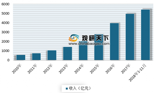 根据国家邮政局发布的数据,近几年我国快递业务量逐年上升,2017年突破400亿件,达到400.6亿件,同比增长28.2%,连续4年稳居世界第一,年业务量占全球45%以上,对世界快递增长贡献率超过一半;快递业务收入完成4957亿元,同比增长24.7%。2018年1-11月,全国快递服务企业业务量累计完成452.9亿件,同比增长26.3%,业务收入累计完成5429亿元,同比增长22.3%。